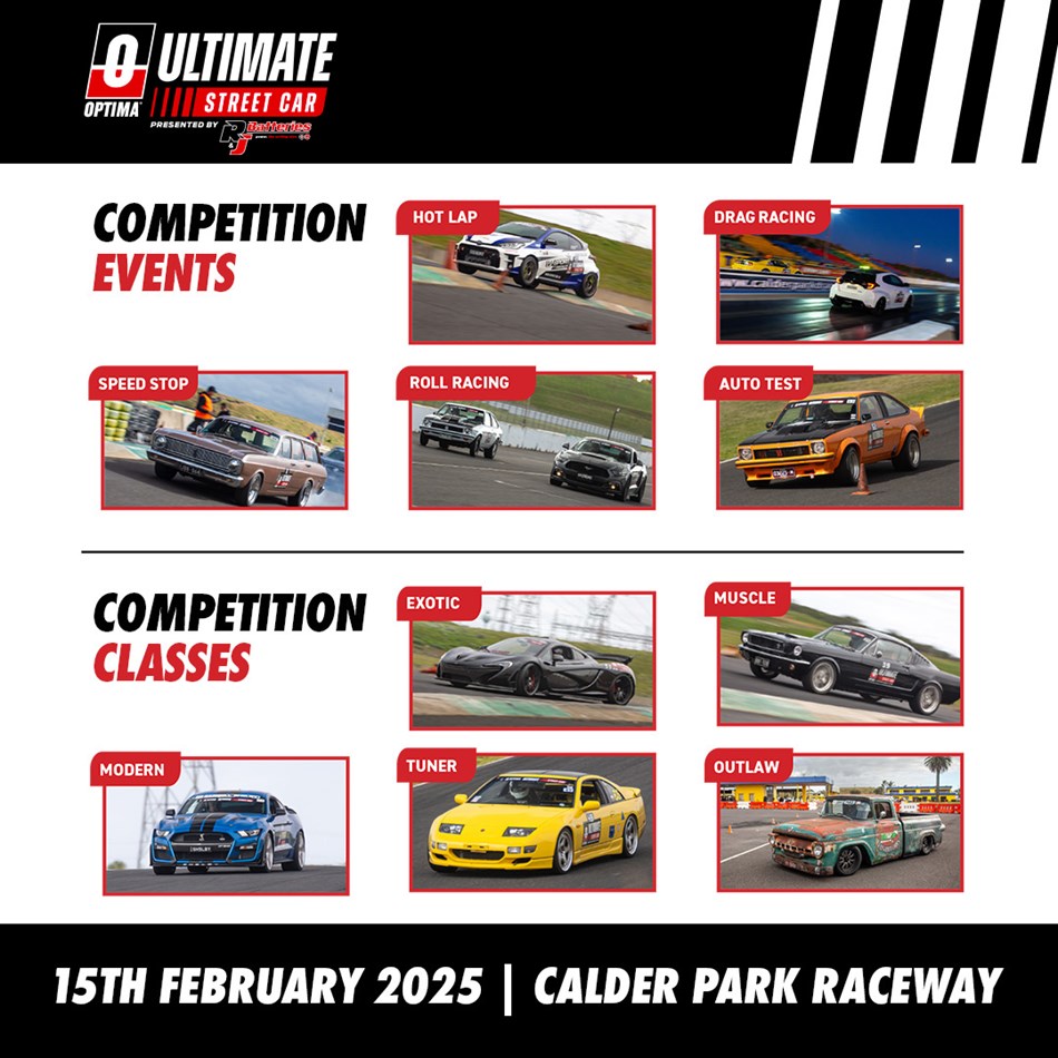 Join the action next weekend at the OPTIMA Ultimate Street Car event presented by R&J Batteries! On Saturday Feb 15th some of the hottest metal in Australia will be heading to Calder Park for a mega day on the track and in the pits.